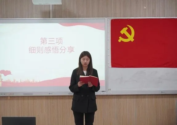 会议在庄严的国歌声中拉开序幕。会上,王瑞娜同志带领全体党员诵读中央八项规定原文。她结合规定的具体条款,援引典型案例进行深入解读与剖析,重点围绕改进调查研究、精简会议活动等内容展开分析;对八项规定的精神实质和实践要求进行系统阐释,进一步深化了学生党员对中央八项规定的系统性认知,切实提升了思想认识高度。随后,顾韵琴同志结合实际,分享对《中共中央政治局贯彻落实中央八项规定实施细则》的学习感悟,她鼓励大家要将这些规定要求切实与日常的学习、工作和生活紧密结合起来,确保每一项规定都能在实际行动中得到贯彻和体现,从细节入手,从点滴做起,发挥学生党员的先锋模范作用。