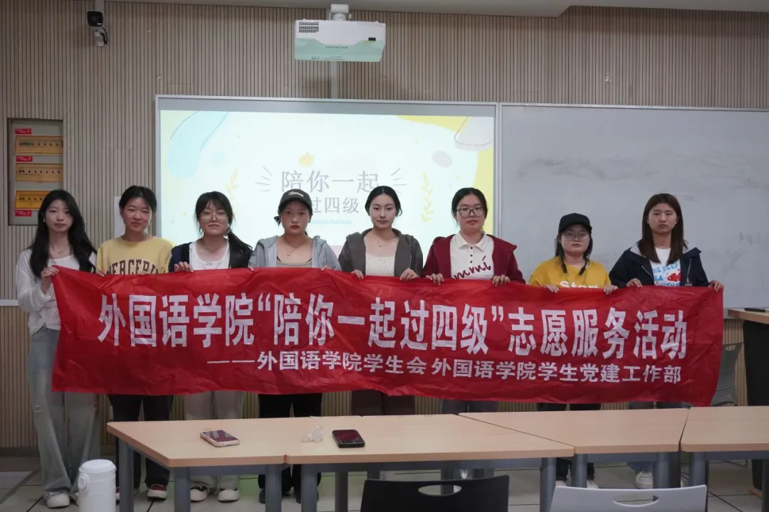 为了提高学生英语水平,营造良好的学习氛围,促进学风建设,外国语学院实践服务部及外国语学院学生第一党支部于2025年4月16日下午4:50,开展“陪你一起过四级”志愿活动。本次活动的主讲人为张康广丽、齐佩雅、陈曼妮、张淼淼四位同学。