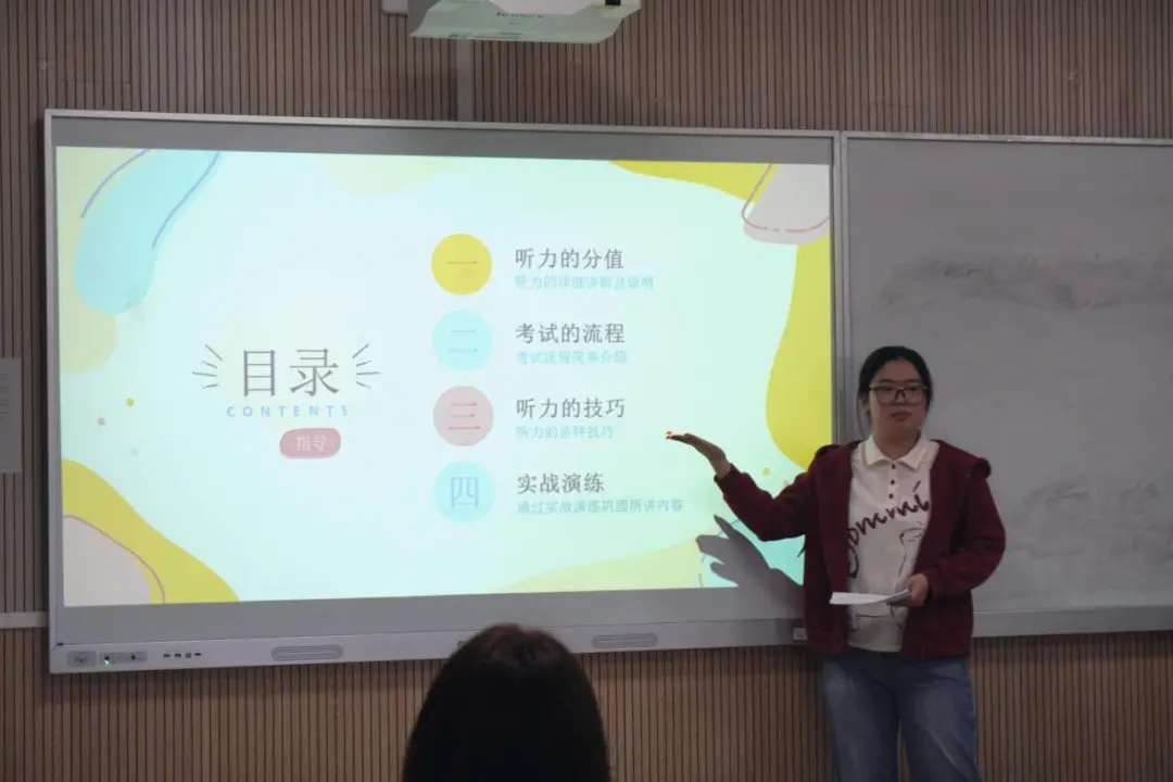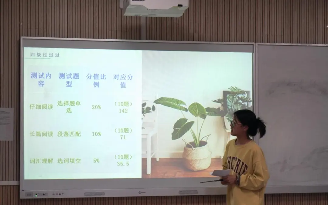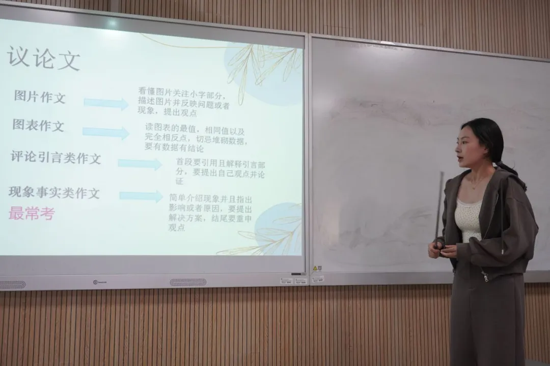 张淼淼同学则选择用历年真题讲解作文模块。她直击四级作文的核心要点,从审题立意、框架搭建到内容填充、语言润色,进行了全面且细致的剖析。她细致的讲解了如何构思观点,并鼓励同学们运用连接词使文章逻辑连贯,运用高级词汇和多样句式提升文采。