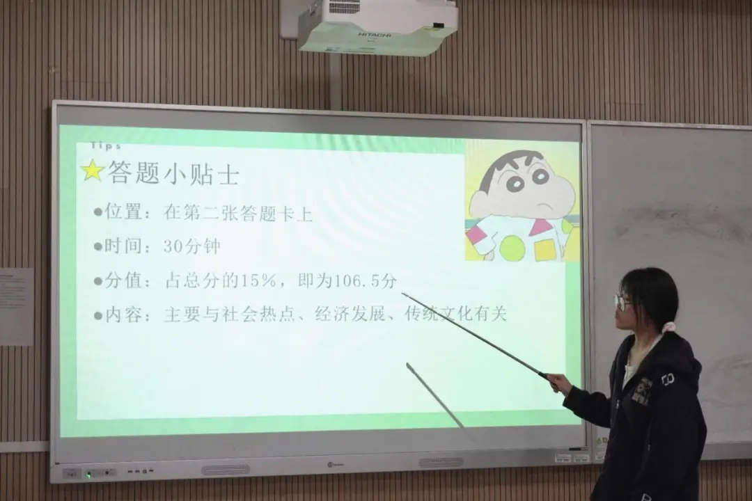 陈曼妮同学从答题贴士、答题技巧、实例应用、短语积累四个方面讲解了翻译模块。她鼓励同学们注重审题和灵活运用词汇和语法。同时,她结合近几年的真题帮助同学们梳理近几年的考题方向,现场展示翻译思路与技巧应用过程。