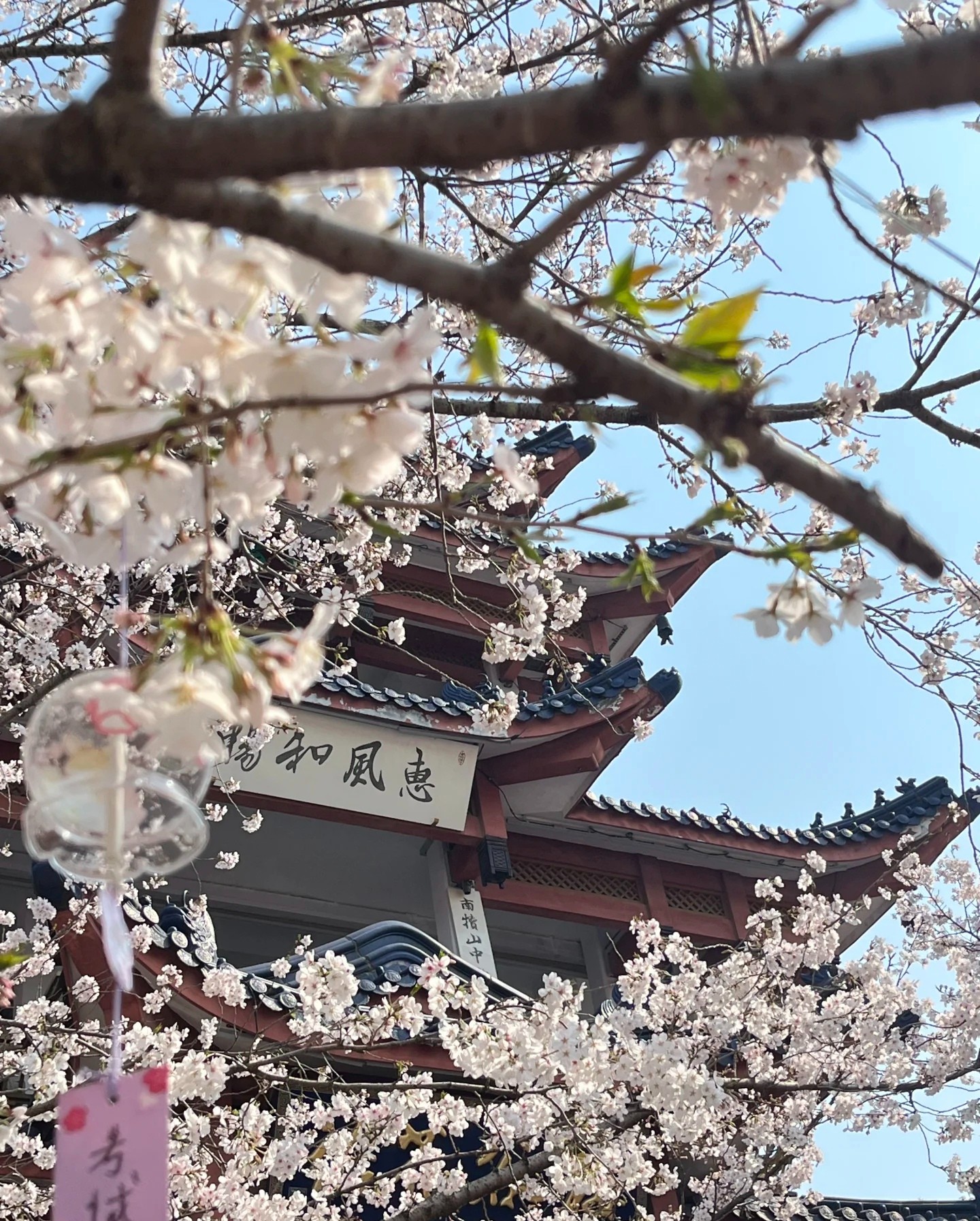 春日里,樱花满树绽放,与古雅楼阁相映成画。风铃轻悬,祈愿牌飘动,或许是游客前来赏樱许愿,留存美好期许于这烂漫春光中。