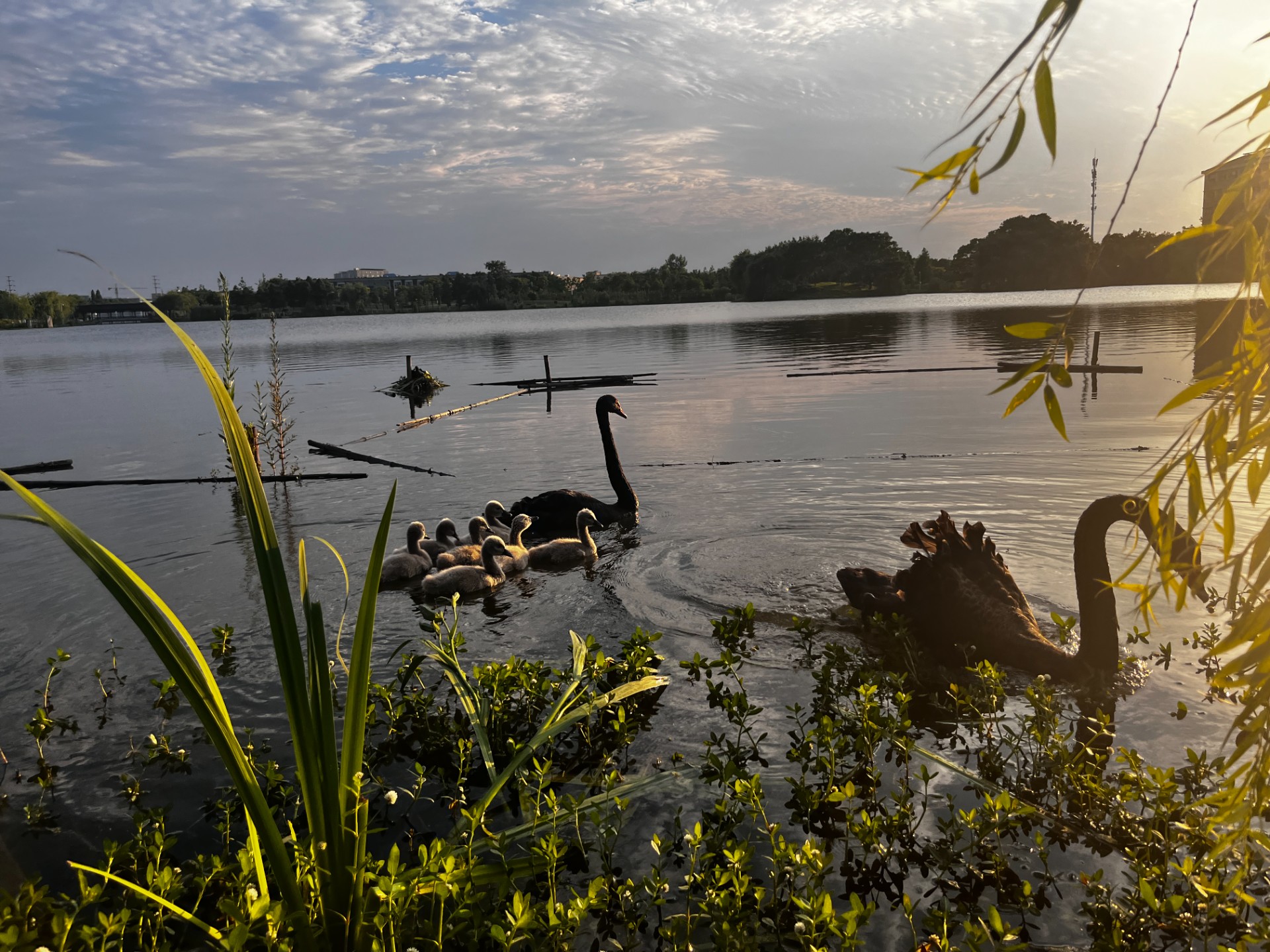 照片捕捉到龙湖黑天鹅一家的温馨瞬间。暖金色的光影轻柔洒落,为画面披上一层梦幻薄纱,粼粼波光与黑天鹅的身影交相辉映,明暗有致,勾勒出自然灵动的线条。黑天鹅一家相伴于湖水,是春日生机的生动诠释。亲鸟引领幼雏,似在传递生命的智慧与力量,寓意着春日里生命的延续与希望的蓬勃生长,宛如一首无声的诗,诉说着自然的美妙与温情。
