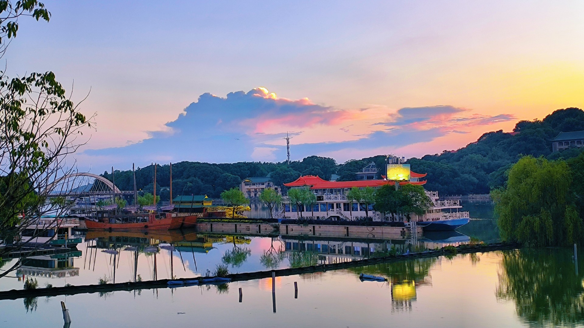 黄昏时分的湖景,湖面如镜,夕阳为太湖勾勒金色轮廓,渔船点缀,似童话般的仙境。看到这副图,我想到了“小桥流水人家”。(无锡所拍)