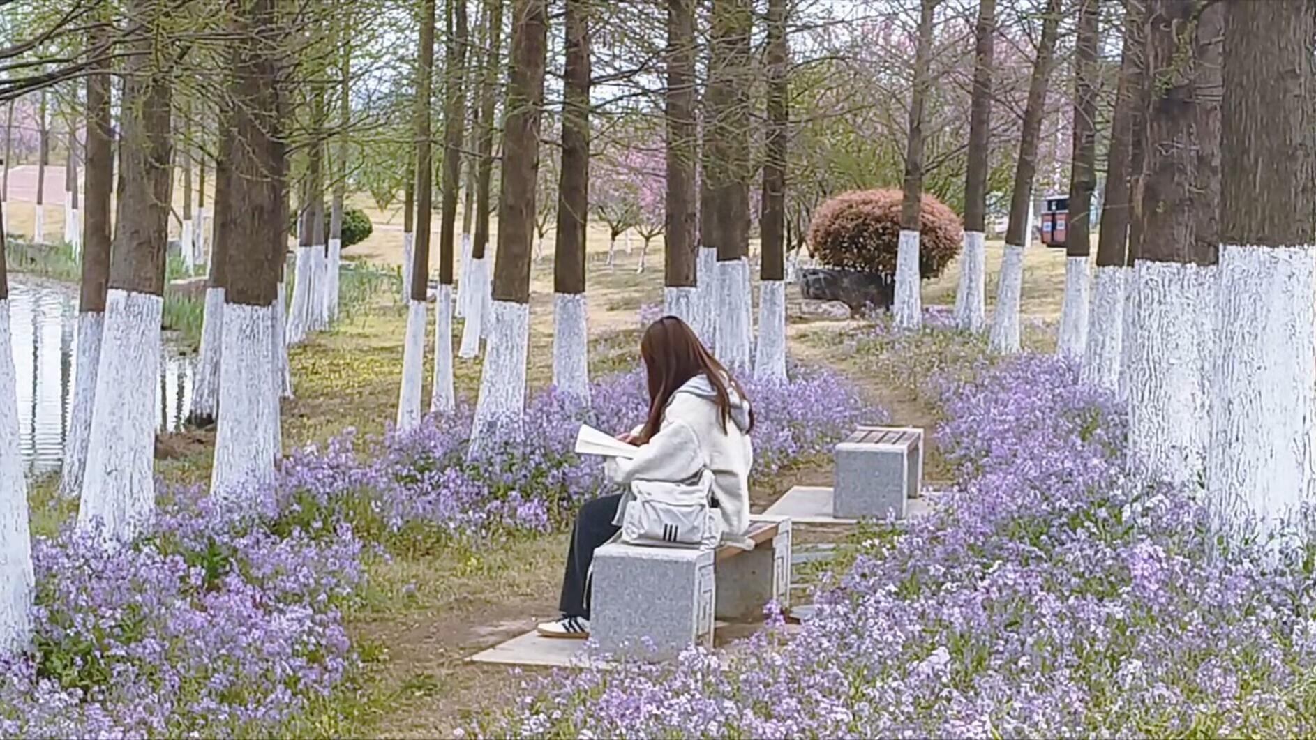 春日林间,她静坐石凳读书。紫花簇拥,树木林立,水光微漾,时光在此刻悠然停驻,满溢宁静与诗意。