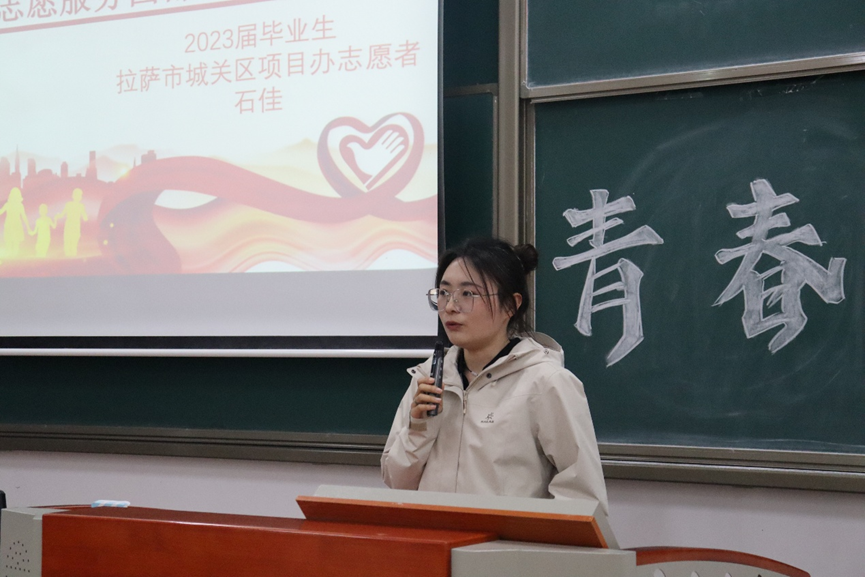 2023 届毕业生石佳则以自己在西藏自治区拉萨市城关区夺底街道办事处的工作经历,讲述西部计划的生动故事。她从报名时的初心出发,详细介绍项目选拔机制、工作内容及心路历程,用边疆服务的真实感悟展现新时代青年的责任担当。