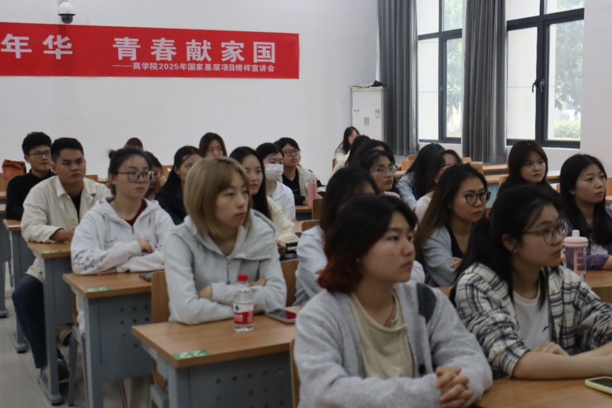 此次宣讲会不仅是政策解读的平台,更是青春理想的对话场域。通过前辈们的经验分享,同学们深入了解两大基层服务项目的政策细则、实施目标及配套支持措施,进一步激发了投身基层建设的热情。相信在未来,会有更多商院学子踏上基层服务之路,在西部沃土和乡村振兴的广阔天地中,用奋斗书写无愧于时代的青春篇章。