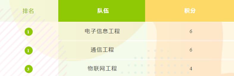 截至目前,通信工程专业与电子信息工程专业凭借 6 积分的成绩并列积分榜榜首,物联网专业则以 4 积分紧随其后。