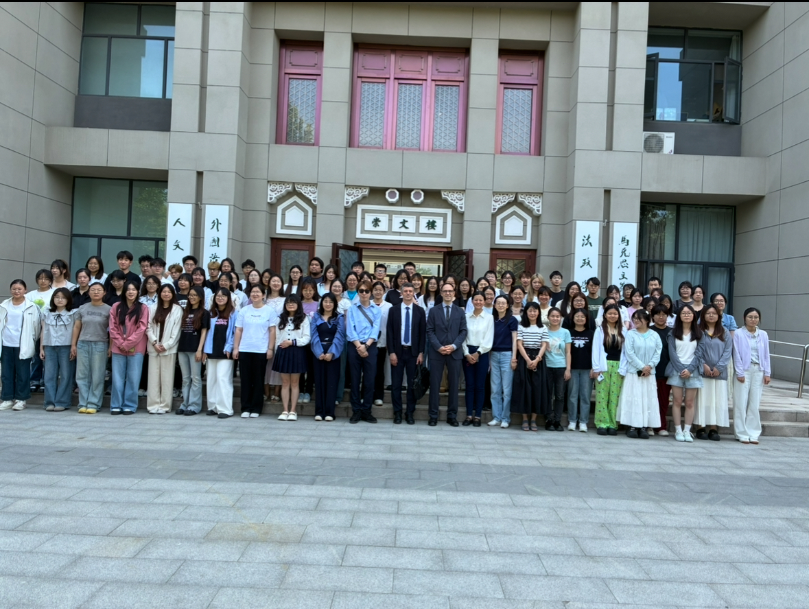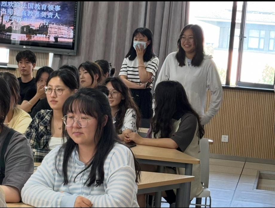 领事一行与三个年级的法语专业学生进行了面对面交流。戴杰明先生以自身的学习和工作经验为例,鼓励学生们多参加跨文化活动,丰富个人的经历,提升自己的眼界;南子跃先生则代表法国高等教育署系统介绍了赴法学习的流程,鼓励同学们努力学习法语,并就院校选择提供建议。随后,两位嘉宾耐心细致地解答了学生关于法语学习、留学申请等方面的提问,现场气氛热烈。