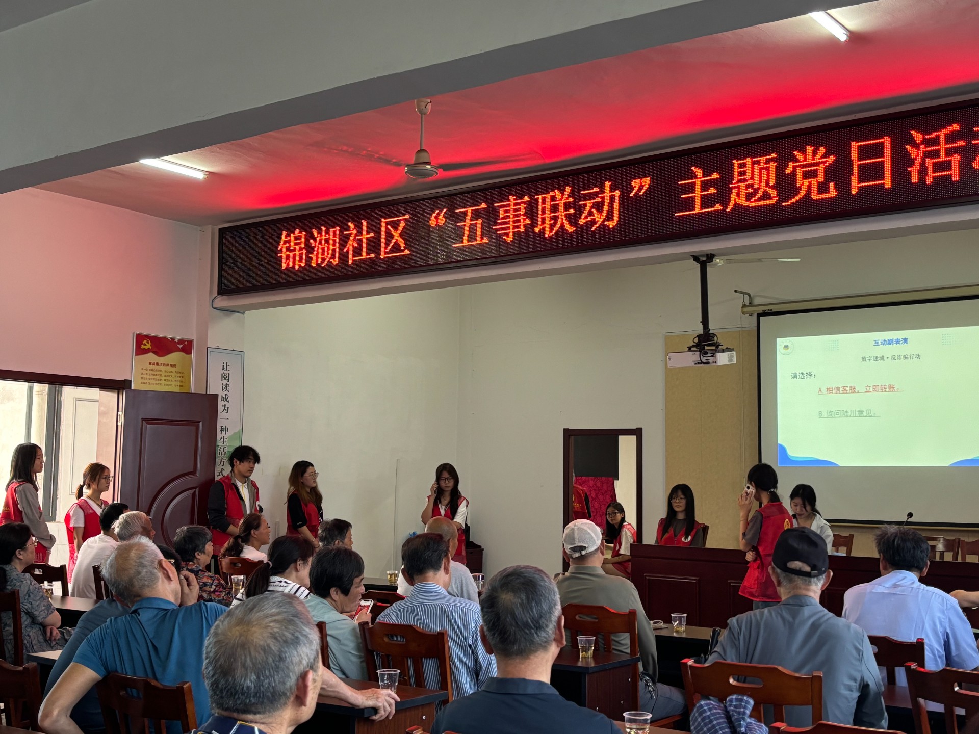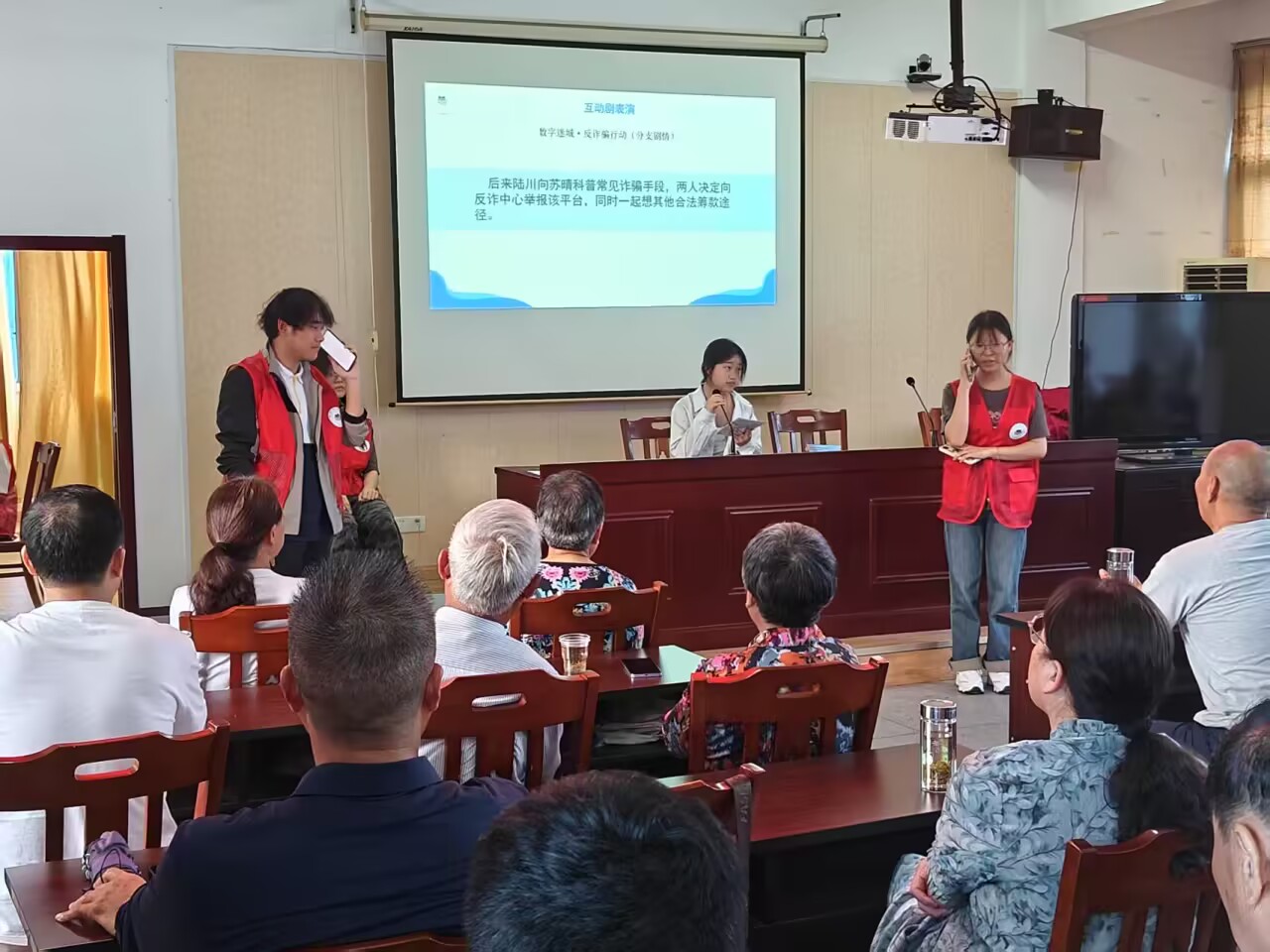 近年来,不法分子们利用老年人信息差和情感弱点屡屡得手,此类现象不仅给老年人个人及其家庭带来了沉重的经济损失,更对社会和谐稳定造成了负面影响。为提升老年人防骗意识,守护社区居民财产安全,法政学院842403班同学们走进丹阳市经济开发区锦湖社区居民委员会,通过知识宣讲、互动剧表演等创新形式,为社区居民们上了一堂生动的反诈课。