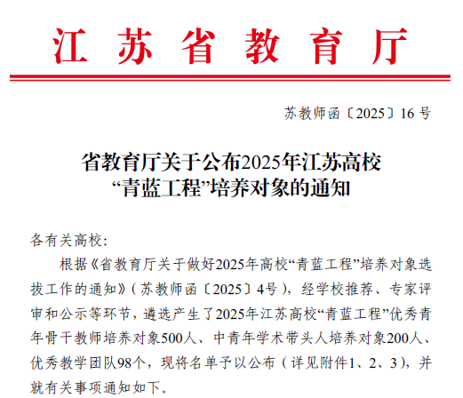近日,江苏省教育厅公布《省教育厅关于公布2025年江苏高校“青蓝工程”培养对象的通知》(苏教师函〔2025〕16 号),人文学院许竹老师凭借其扎实的专业素养和出色的科研能力,成功入选“青蓝工程”优秀青年骨干教师培养对象。