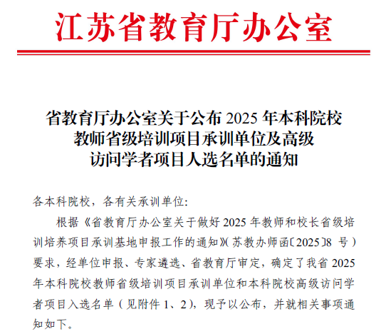 近日,江苏省教育厅公布了2025年本科院校高级访问学者项目人选名单,人文学院周研老师成功入选。这已是我校教师连续两年获此殊荣,这一喜讯为学校师资队伍建设注入了新的活力。