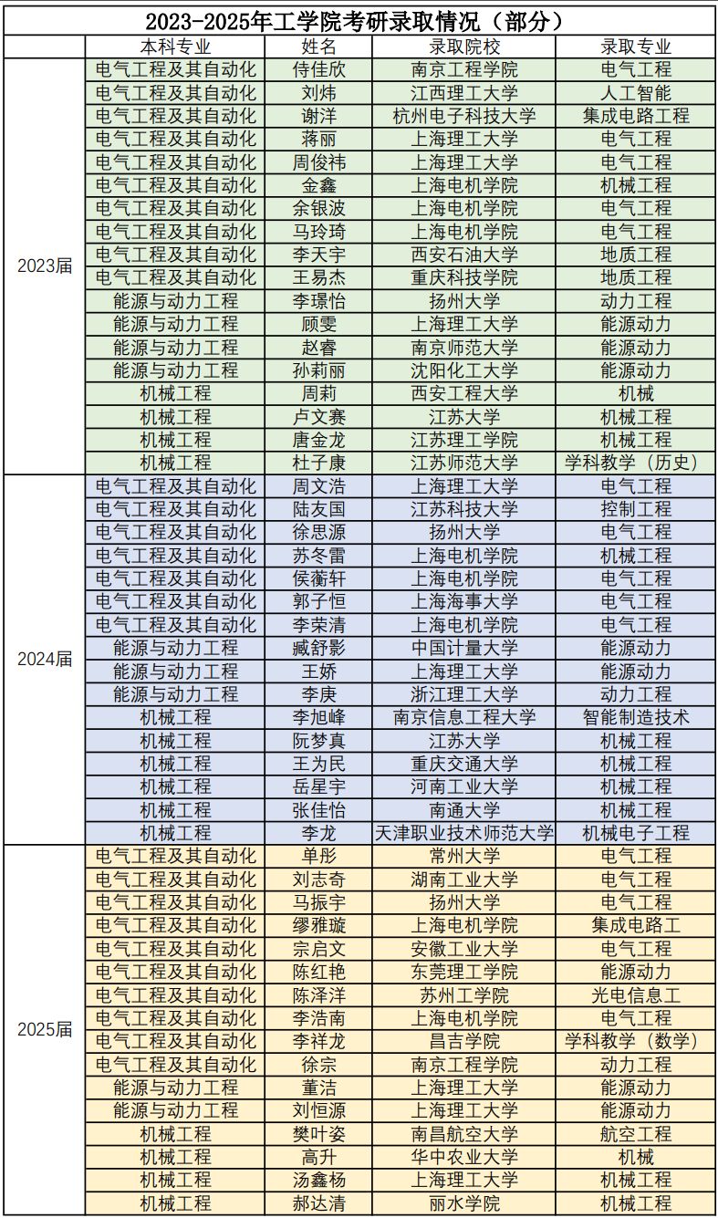 三年来,工学院学子在升学道路上乘风破浪,勇毅笃行,一届届学子以梦想为舟、以奋斗为桨,在升学深造的征程中交出了一份份令人瞩目的答卷。2023-2025年累计共有113人成功上线,升学录取总人数达77人。众多优秀学子凭借出色表现,被南京师范大学、暨南大学、上海理工大学、英国曼彻斯特大学、江苏大学、华中农业大学、扬州大学等多所国内外高校录取。他们以优异的成绩和坚韧的意志,为学弟学妹树立了坚实的榜样,展现出我院学子卓越的风采。