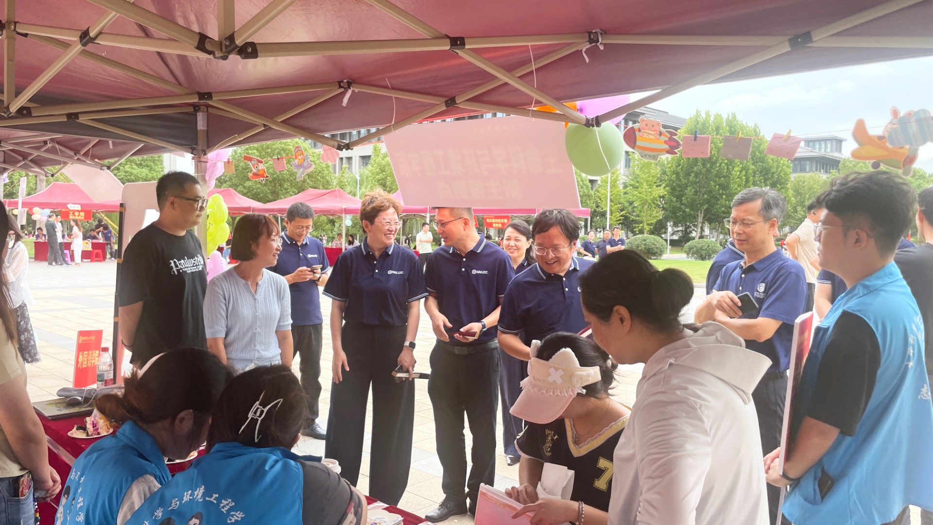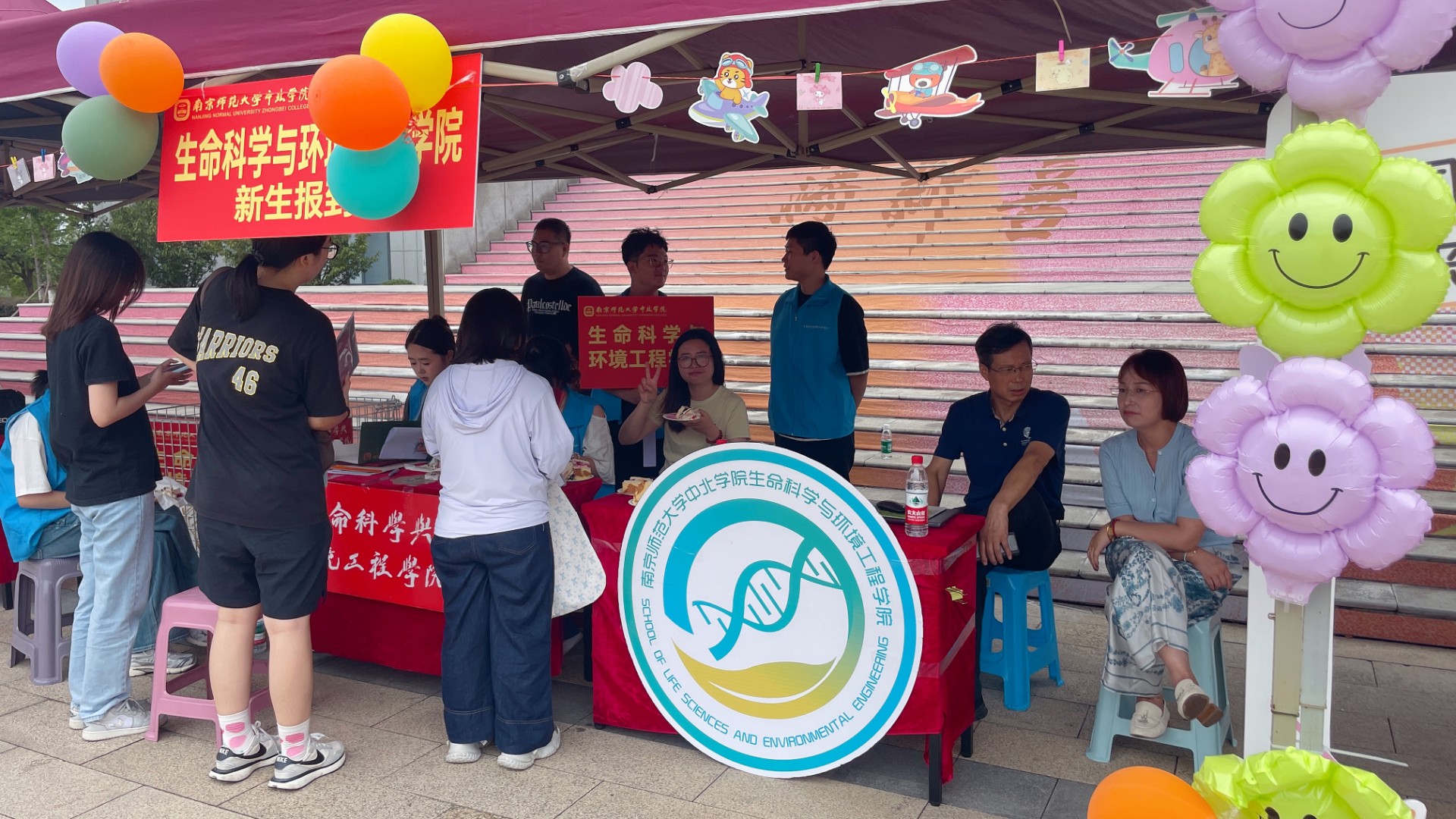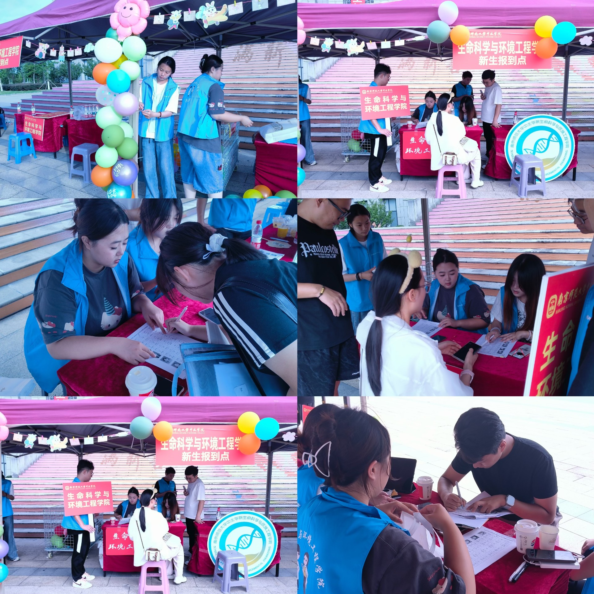 为保障迎新工作高效、有序且温馨,学院提前在图书馆门口设置了迎新点。气球与立牌点缀其间,两顶帐篷相映成趣,整个现场洋溢着热烈与喜庆的氛围。