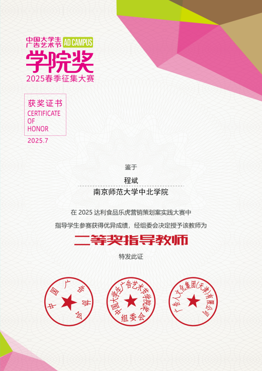 在近日落幕的中国大学生广告艺术节学院奖2025春季征集大赛中,人文学院学子表现突出,共斩获国家级二等奖1项、优秀奖39项!程斌老师获评“二等奖指导教师”。这一优异成绩充分展现了人文学院学生在广告创意、视觉表达与传播实践方面的综合素养与创新能力。
