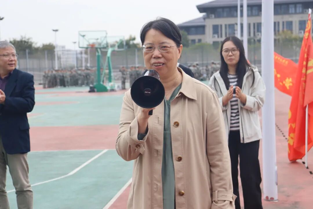 随后,党总支书记孙茂华作总结发言。她对前一阶段的军训内容进行总结,回顾了队列训练、军体拳、体能训练等多个环节的开展情况与初步成果,并对后续训练计划作出展望。她强调,军训不仅是对体能和意志的锤炼,更是一堂生动的爱国主义教育课。在谈到拉练环节时,孙茂华特别指出,此次拉练主题与“四史”教育紧密结合。她提到,1999年南联盟大使馆被炸是对中国主权的粗暴侵犯,当时广大青年学生义愤填膺,用行动表达了对祖国的热爱与捍卫。今天的拉练,正是继承和发扬这种爱国精神,把“正义之师、捍卫和平”的信念深深扎根在心中。