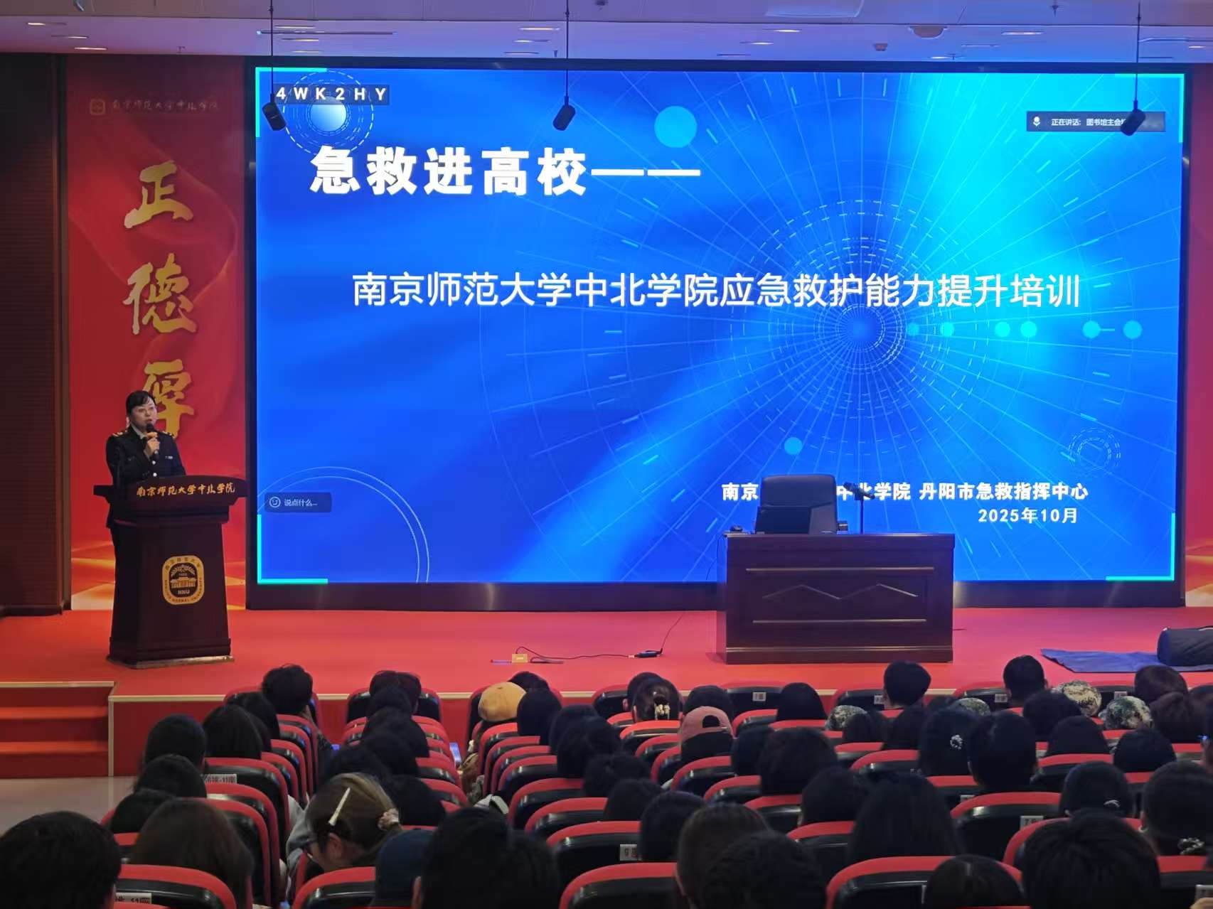 为广泛普及急救知识,切实提高大一新生的自救互救能力,作为新生安全教育的一部分,10月23日晚,后勤与保卫处联合学工处,邀请丹阳市急救指挥中心专家,在图书馆报告厅、教学楼,以线上+线下相结合的形式,组织全体新生参加应急救护能力提升培训活动。