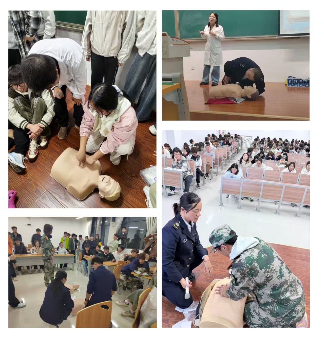 接着,培训人员以“黄金急救四分钟”为切入点,系统拆解了心肺复苏(CPR)操作流程,解析了海姆立克法的操作技巧,讲解了自动体外除颤器(AED)的使用规范,创伤急救的基本常识。一系列实用的急救技能,让同学们较为全面地了解了在心脏骤停、气道梗阻等紧急情况下可采取的应对步骤。