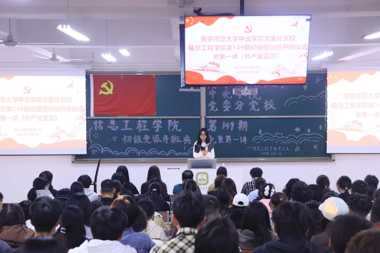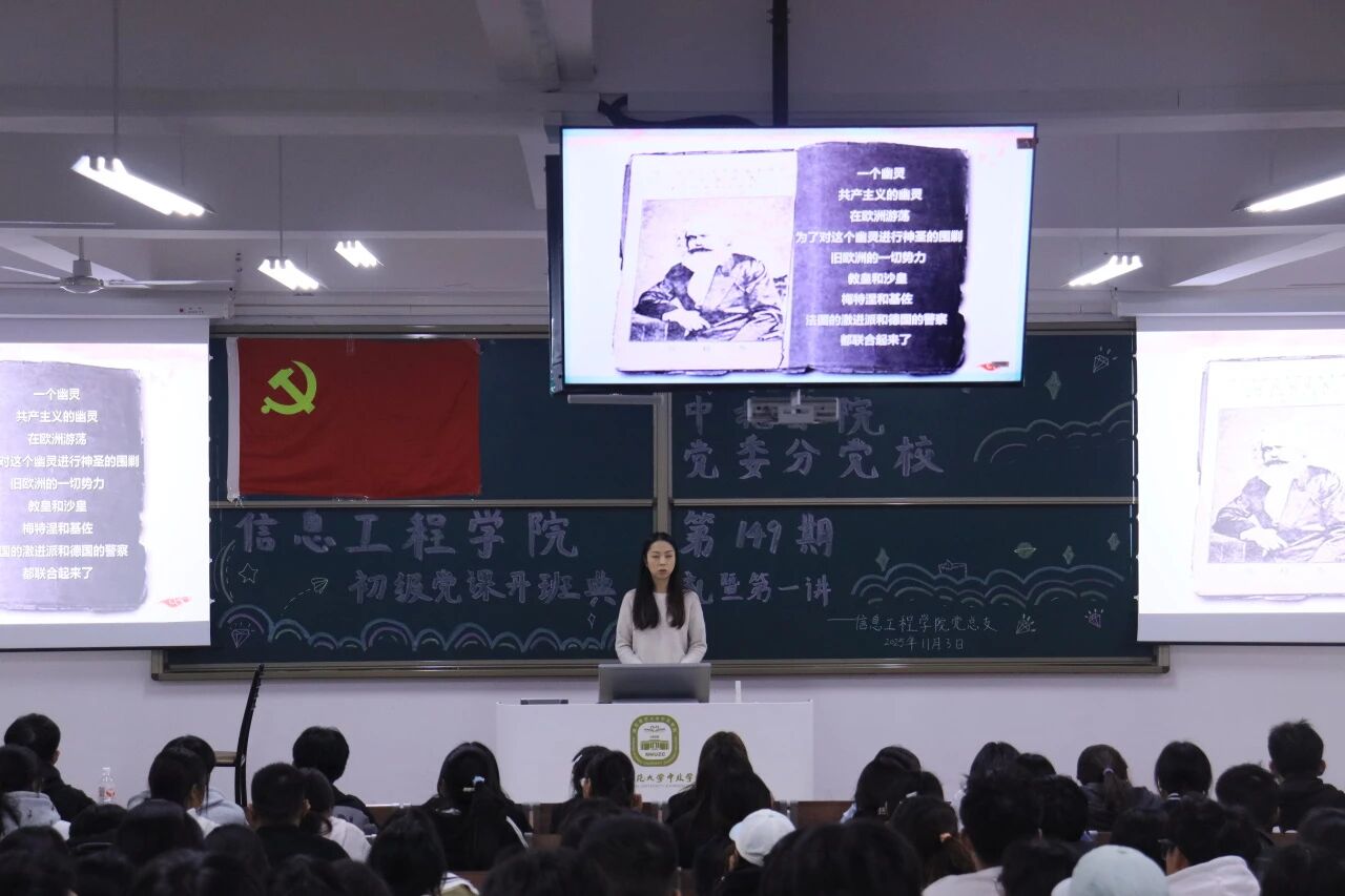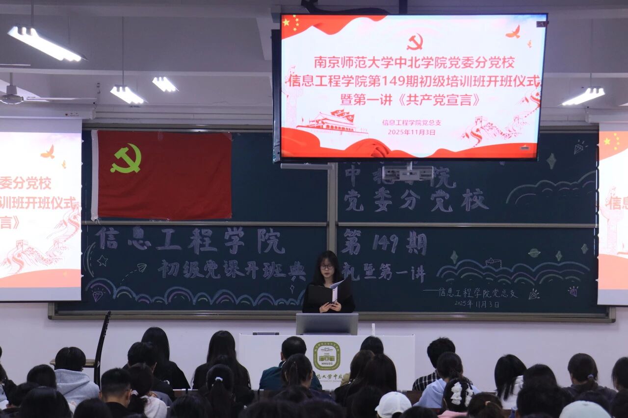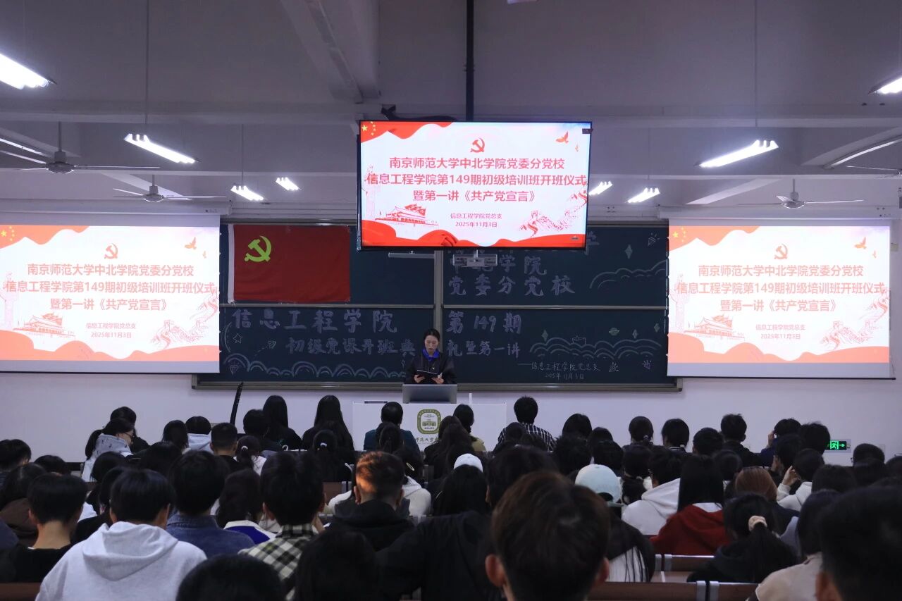2025年11月3日,ky.com党委分党校信息工程学院第149期初党培训班开班典礼暨第一讲《共产党宣言》于一教229顺利举行。信息工程学院党总支书记孙茂华、党总支副书记周健、学工办主任王志超、信息工程学院学生第一党支部书记杨艳、信息工程学院学生第二党支部书记张艺茹出席本次开班典礼。