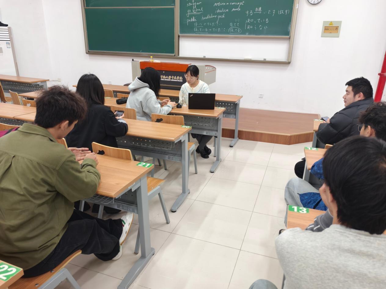 2025年11月6日下午,在敏学楼109教室内,为准备日语研学活动,李莹老师指导学生许若涵、彭海峰、刘虔懿等同学确定此次研学活动的论文选题。