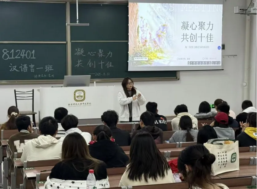 为明确大二学年奋斗目标,进一步增强班级凝聚力,812401班于2025年11月12日组织召开了“凝心聚力 共创十佳”主题班会。班会伊始,辅导员邹嫦仙老师作开场动员,强调了争创“十佳班级”对于推动班级整体建设的重要意义,并介绍了本次班会的主讲人——班主任袁晗老师,为班会营造了积极进取的良好氛围。