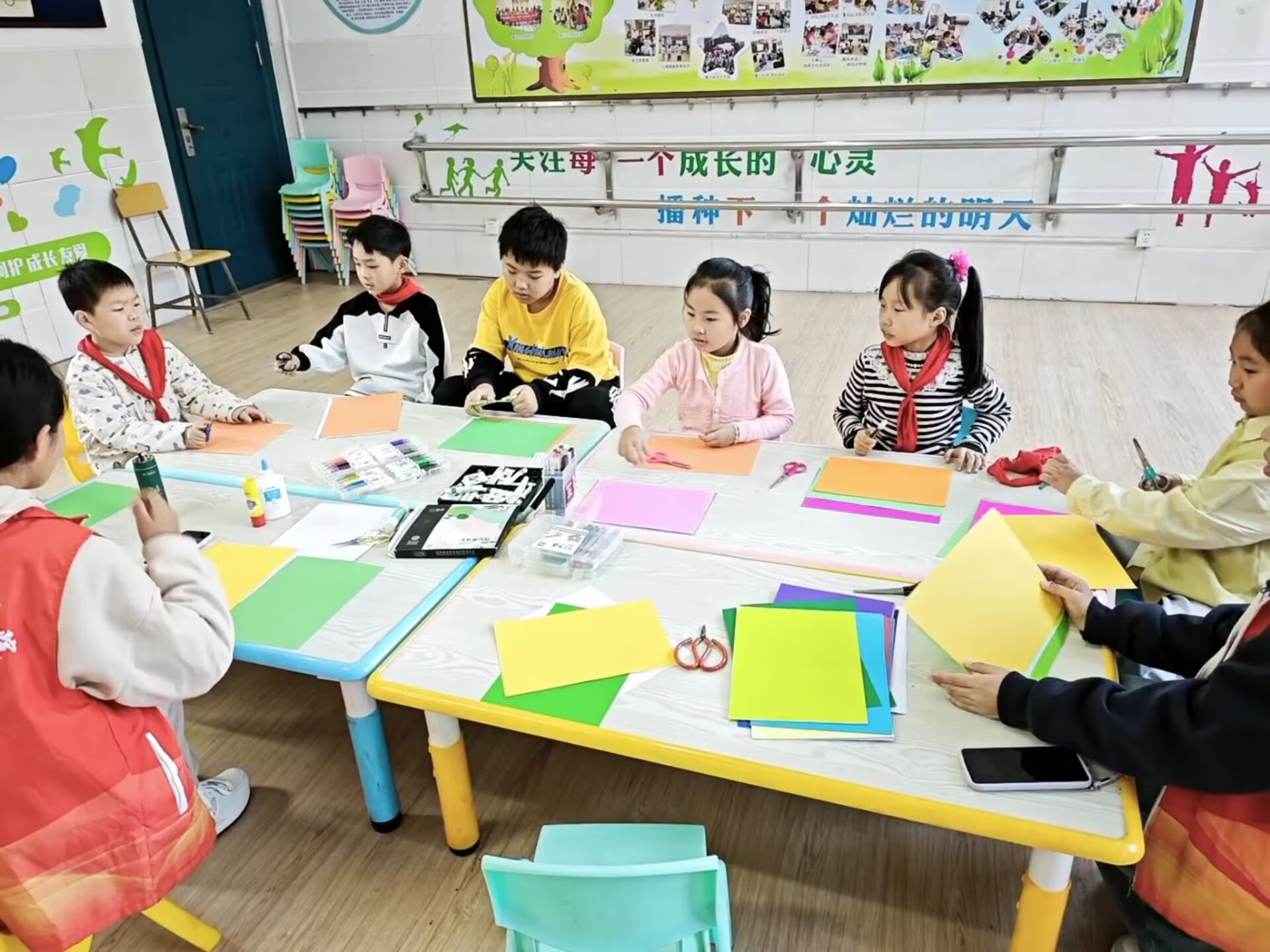 手工制作环节,志愿者们从讲解剪纸寓意、示范折叠手法到指导裁剪花纹,全程协助孩子们制作“事事如意”主题剪纸。
