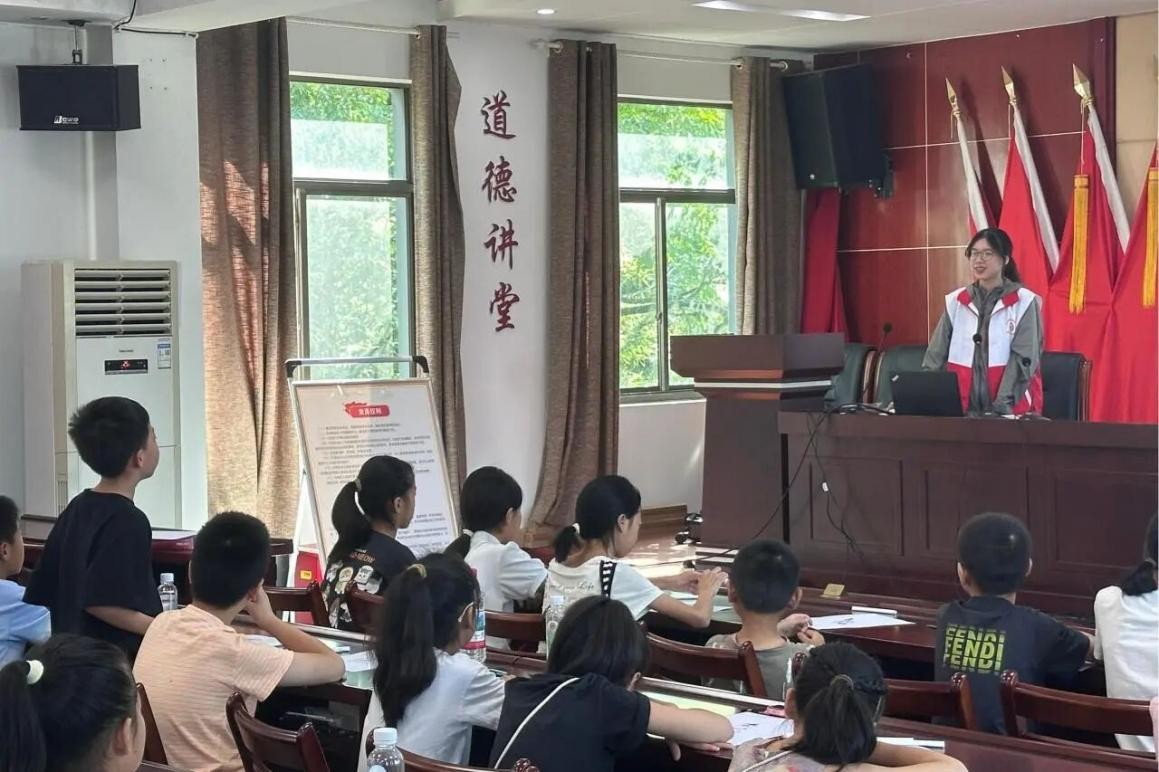 图为团队成员在石濑村爱心暑托班开展宣讲活动