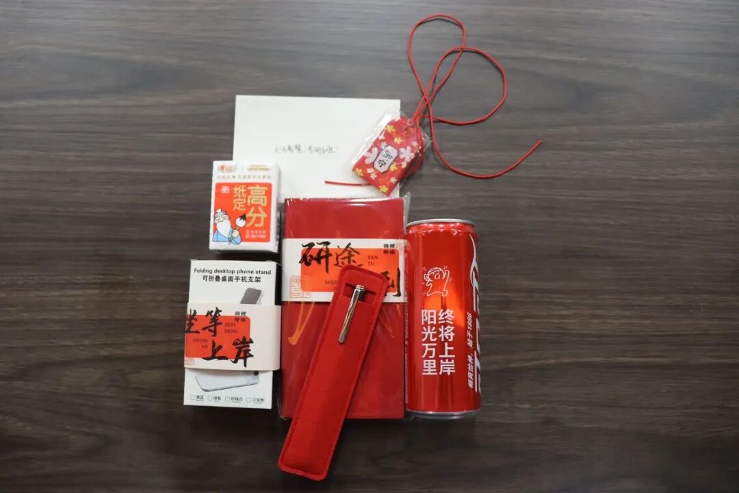 学院为考研学子精心准备了考研加油礼包,内含笔记本、笔、明信片、考研纪念款可乐、手机支架等,每一份礼物都凝聚着学院对学子的牵挂与期许。现场温馨氛围浓厚,“一‘研’为定,成功上岸”“全力以赴,不负韶华” 的暖心话语回荡其间,让备考路上的学子们倍感温暖与鼓舞。