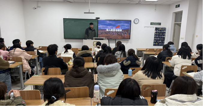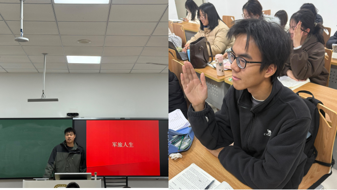 为弘扬军旅精神、丰富校园文化、引领学生成长,2025年12月4日,商学院于一教409教室成功举办军旅故事分享会。活动特邀2023级退役复学学生王宇担任主讲,王宇同学在2023年3月至2025年3月期间服役于中国武装警察部队某部。本次分享会,他通过真实故事讲述与互动交流,生动诠释军人品格,为现场同学带来一堂深刻的思想启迪课。