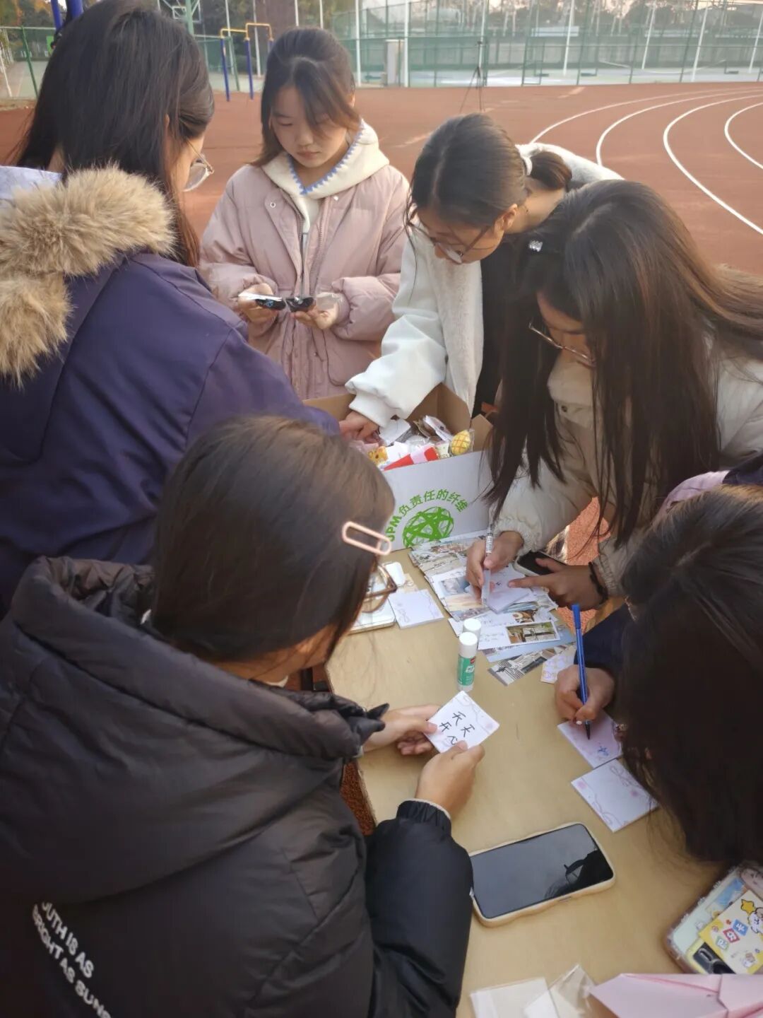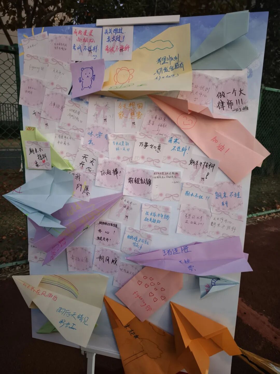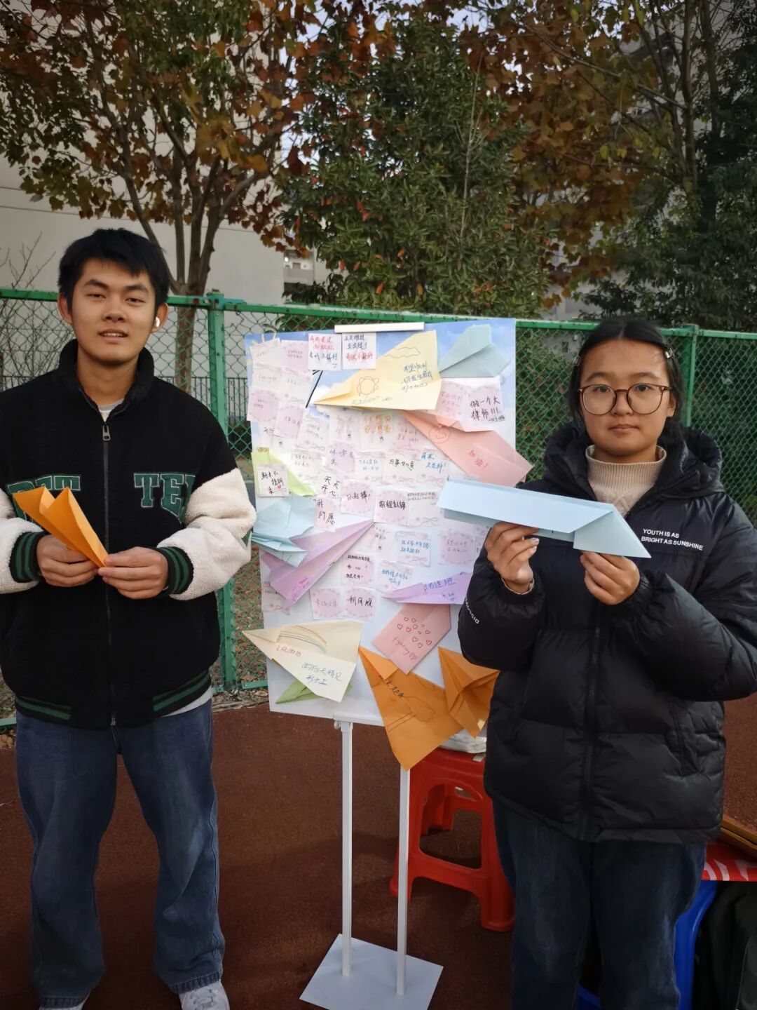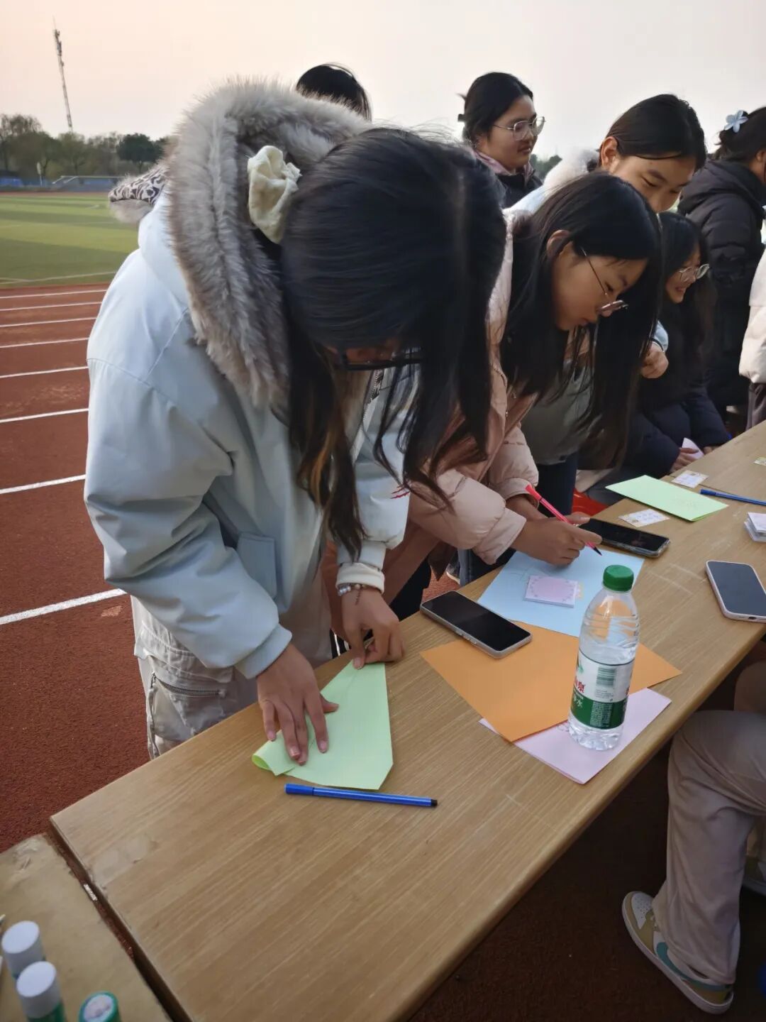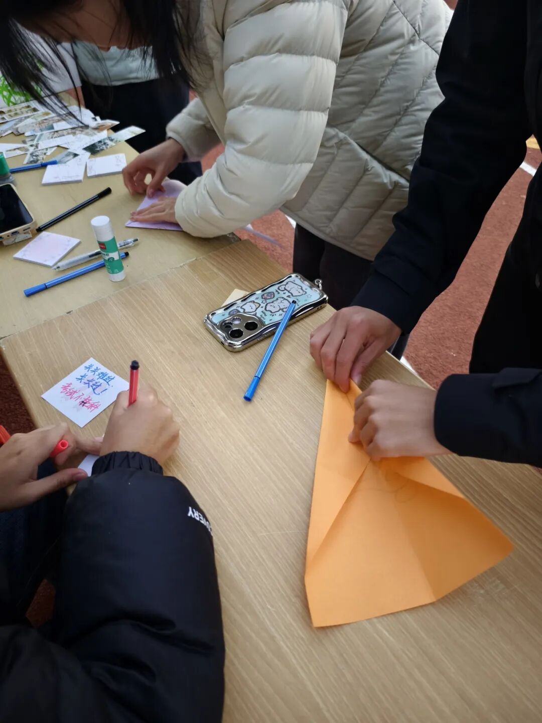 “折纸飞行挑战赛”环节鼓励同学们勇敢向前。参与者用3分钟时间自由创作,折出1架“纸飞机”,并在飞机上写下鼓励语。在指定起点投掷纸飞机,根据飞行距离决定获得印章数量。这一环节通过手工创作与物理投射相结合,让同学们在放飞纸飞机的过程中释放压力,感受前进的力量。