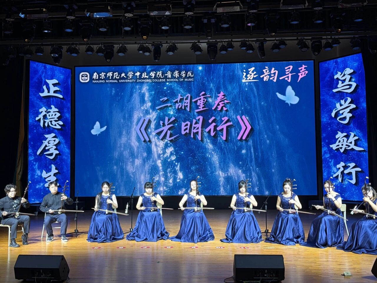“逐韵寻声” 篇章中,对唱《美丽的神话》以声线交织缱绻深情,舞台剧朗诵《泱泱华夏》喊出 “以我少年志,护我华夏魂” 的铮铮誓言,二胡重奏《光明行》奏响冲破晦暗的信念,流行演唱《小地方大梦想》传递平凡生活的滚烫向往。
