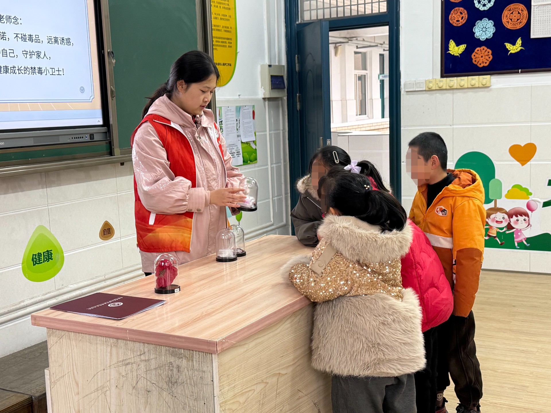 在互动游戏环节中,志愿者们组织小朋友们对毒品模型进行辨认,进一步强化了对毒品的认知与防范意识。
