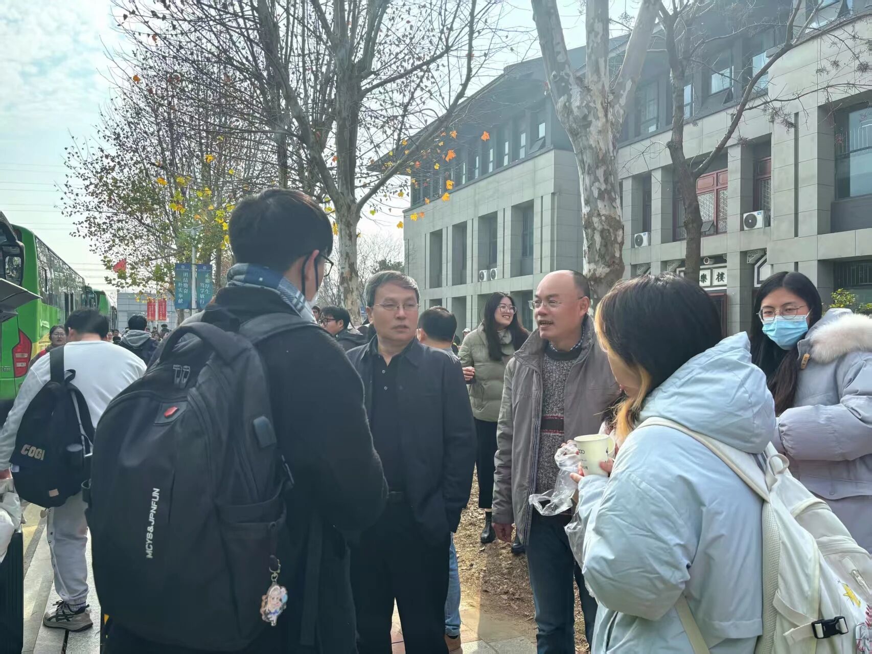 冬日午间,阳光透过梧桐枝桠,在人行道上洒下斑驳光影。院长党银平与党总支书记殷飞提前抵达送考点,为即将奔赴考场的学子送上温暖祝福。他们与每位即将登车的同学亲切交谈,细心了解考前准备,并再三叮嘱注意事项。