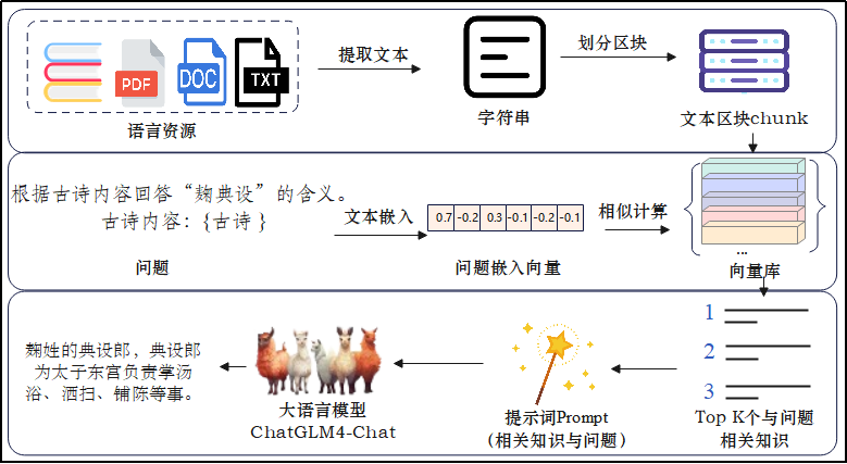 RAG模块的核心思想是通过检索外部知识库(如词典、鉴赏书籍等)来增强生成模型的输出能力,从而为未登录组块生成准确且上下文相关的笺注信息。本文中,RAG检索增强生成模块的流程如图3所示。
