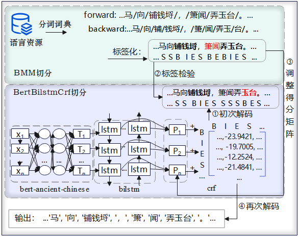 融合BMM和BBC模型的分词结果时,根据BMM分词得到的标签序列,对应地调整模型的初始发射得分矩阵P,使得模型在解码时更倾向于根据设定的规则融合BMM切分的结果,从而结合两种方法的优势。