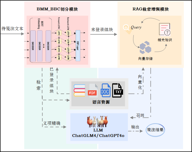 图1展示了自动笺注研究框架。笺注时,首先使用BMM_BBC切分模块对待笺注文本进行切分。接着,对每个切分后的组块在语言资源中检索是否存在相关的释义。当存在时,调用大模型进行义项消歧。当某个组块为未登录组块时,则使用RAG检索增强模块生成注释信息。
