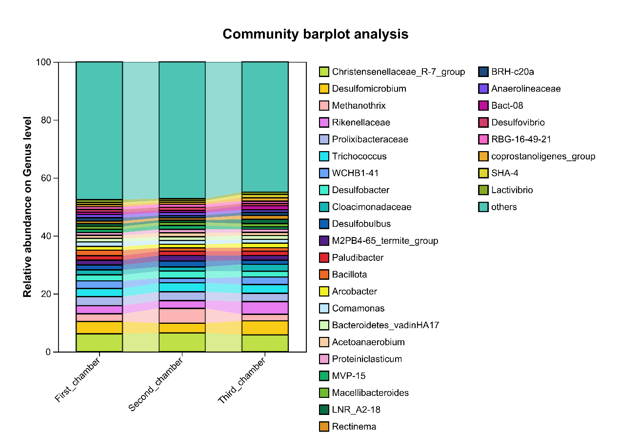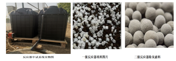 本技术由ky.com与无锡泽邦环保技术有限公司合作研发。系统由两个反应器构成,每个反应器内各有3个反应仓。一级反应器内的3个仓分别放入φ150聚氨酯填料+生物菌种、φ100凝胶填料+生物菌种和φ100凝胶填料+生物菌种,用于厌氧挂膜。填料具有较高的比表面积,能够极大地提高生物量,高效处理生活污水。二级反应器的前面2个仓分别放入φ100凝胶填料,具有良好的除臭作用,最后1个仓为资源利用仓。污水首先通过计量泵送入一级反应器,经过3级厌氧净化处理后进入二级反应器,通过除臭处理后进入资源利用仓,然后灌溉回用。
